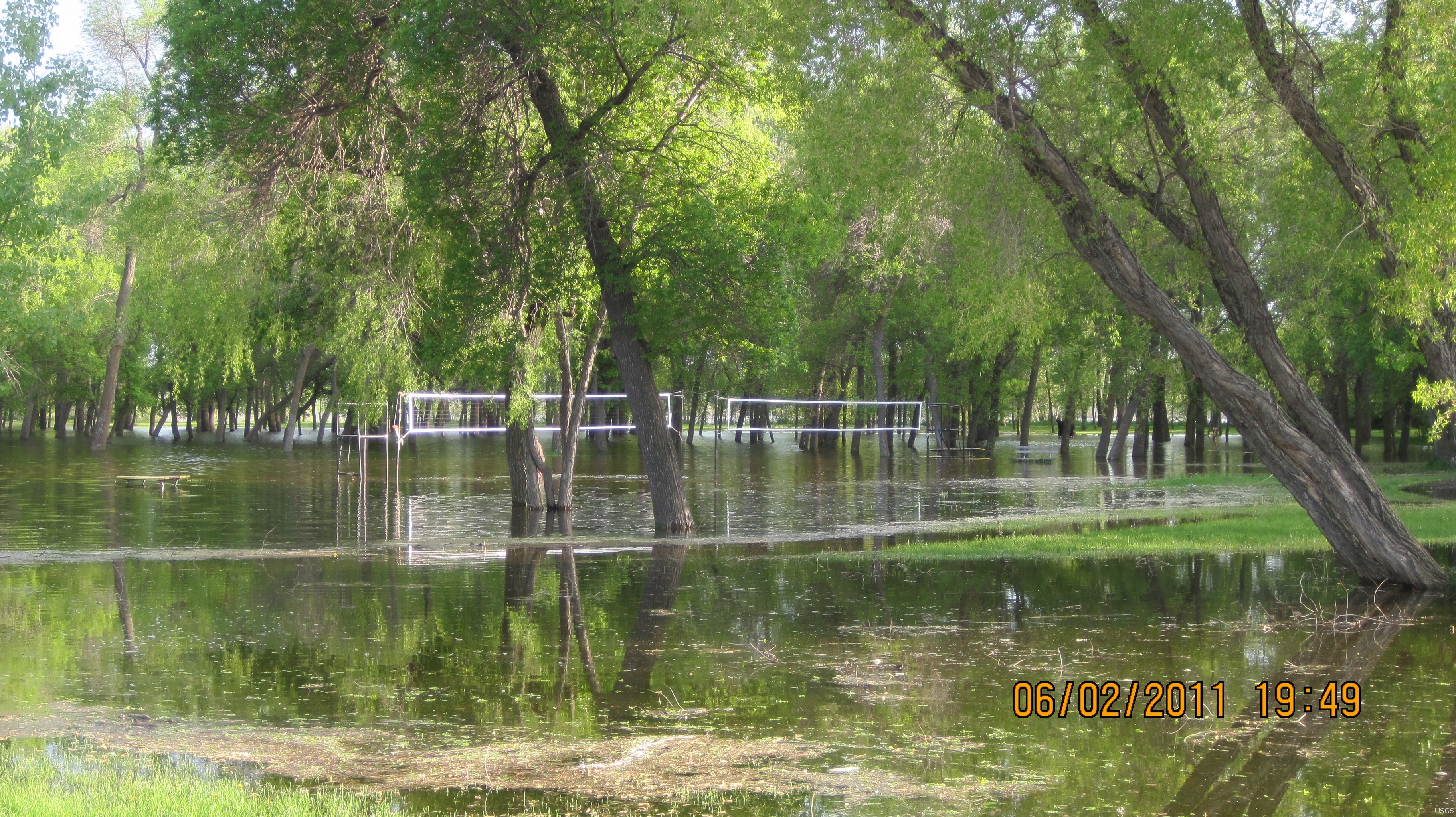 The Missouri River flooded the volleyball courts at Pioneer Park in Bismarck, North Dakota.