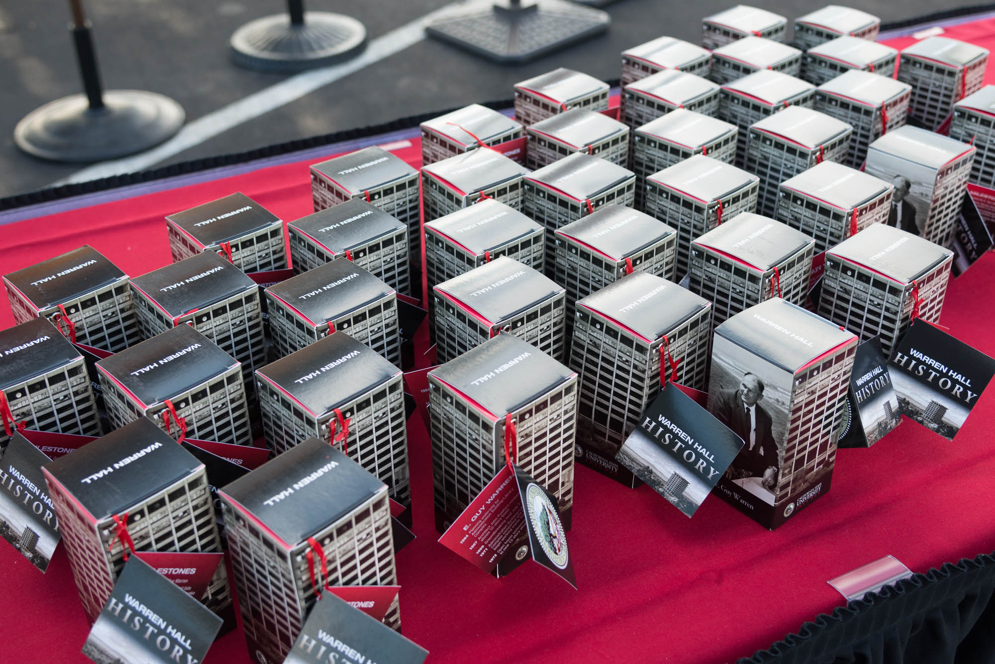 Warren Hall memorabilia containing a piece of concrete from the building.