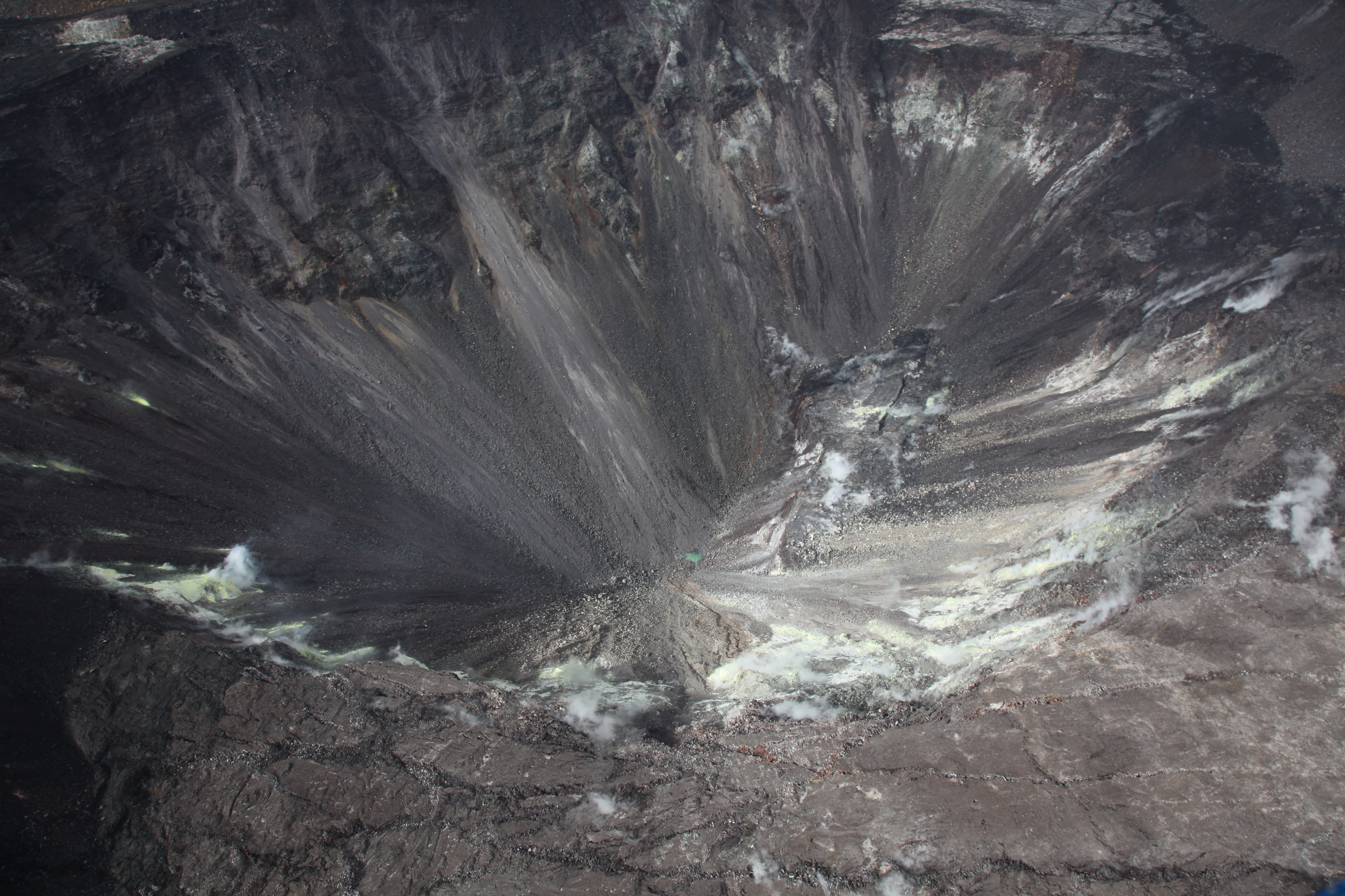 Aerial view of Halema‘uma‘u at the summit of Kīlauea taken during a USGS Hawaiian Volcano Observatory helicopter overflight on August 1, 2019. The small green patch visible at the bottom of Halema‘uma‘u is a new pond forming at the lowest point of the crater. The pond is at about 540 m (about 1772 ft) elevation. USGS photo by S. Conway.