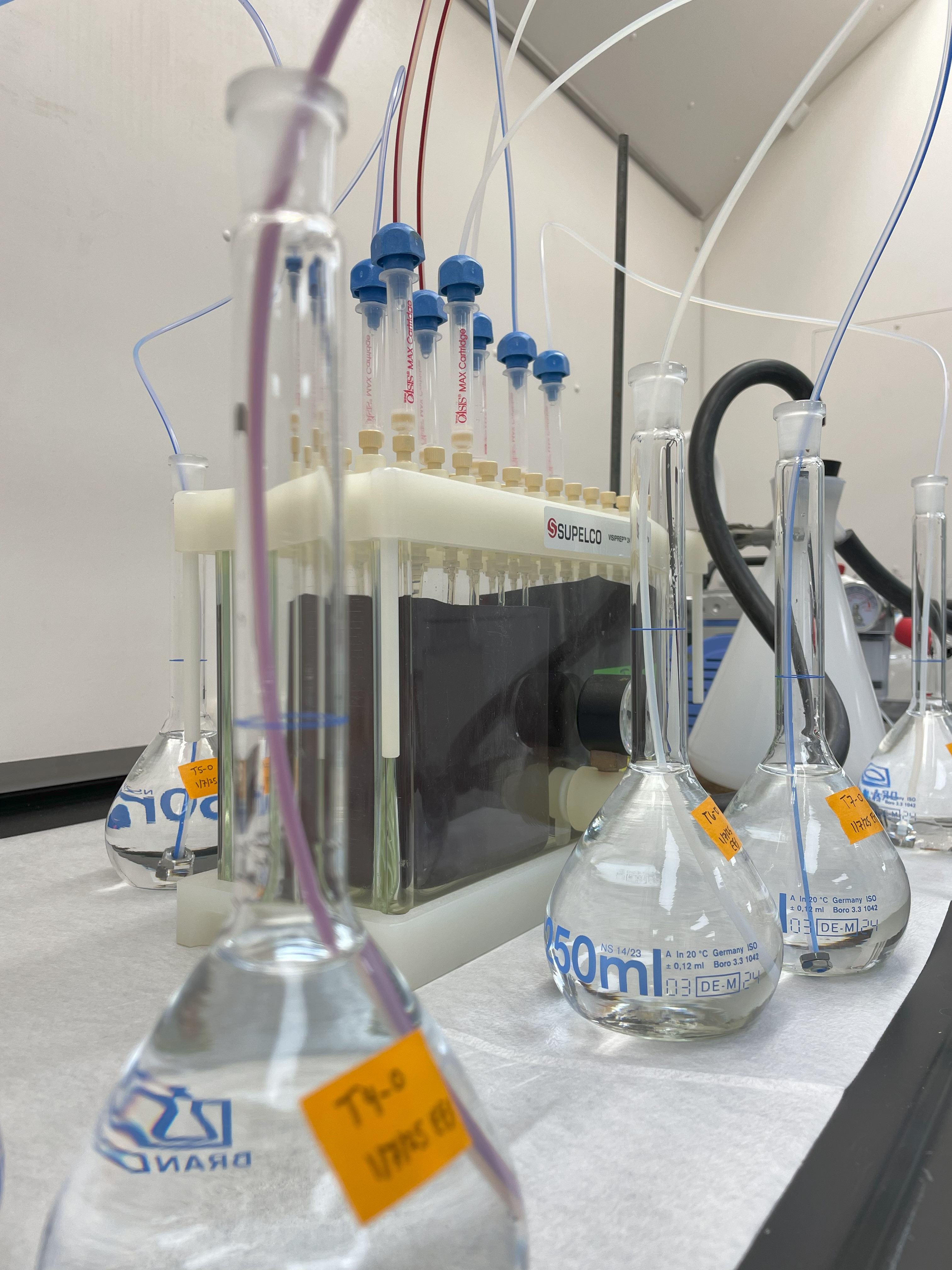 A water sample undergoing solid phase extraction to concentrate the chemical of interest for analytical verification using high-performance liquid chromatography and a triple quadrupole mass spectrometer.