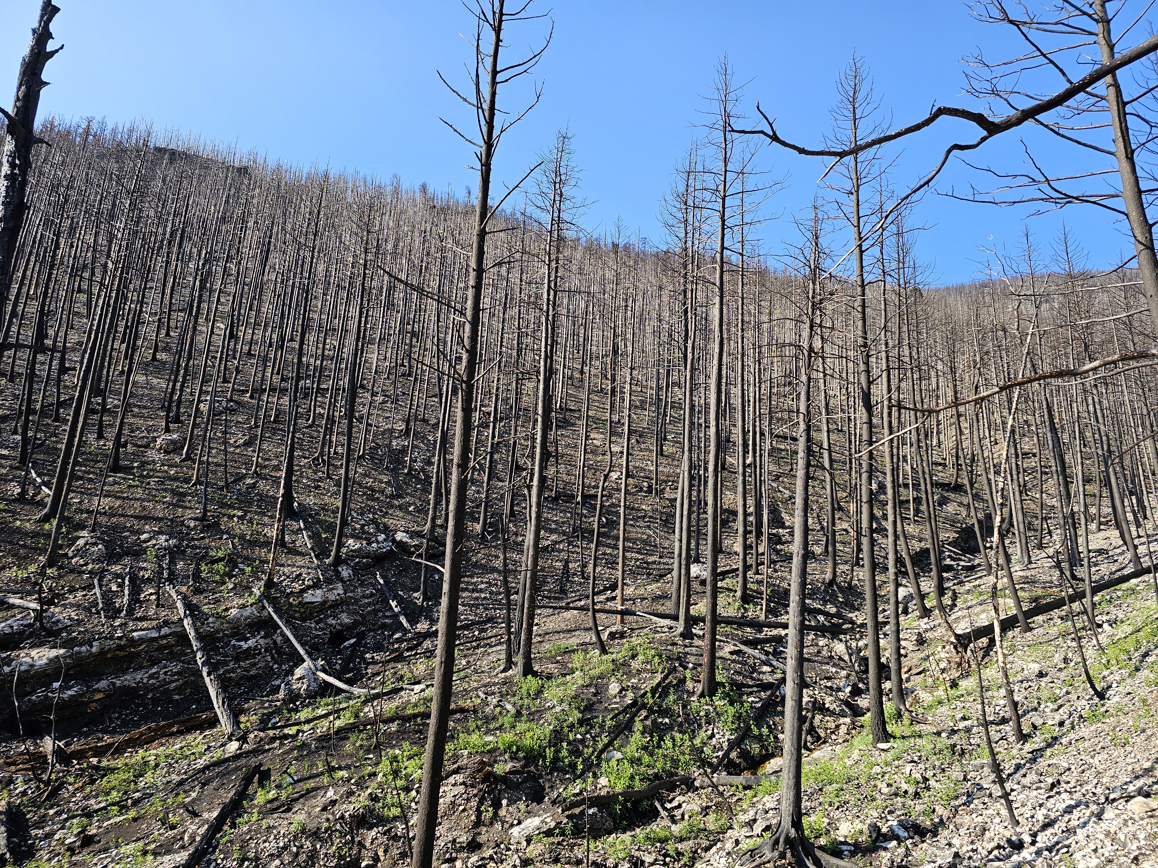 View looking upstream in a small watershed within the 2025 Elk Fire burn area near Dayton, Wyoming. The USGS installed a landslide monitoring station here to characterize postfire hydrologic responses to rainfall events. Photographer: Matt Thomas, USGS.