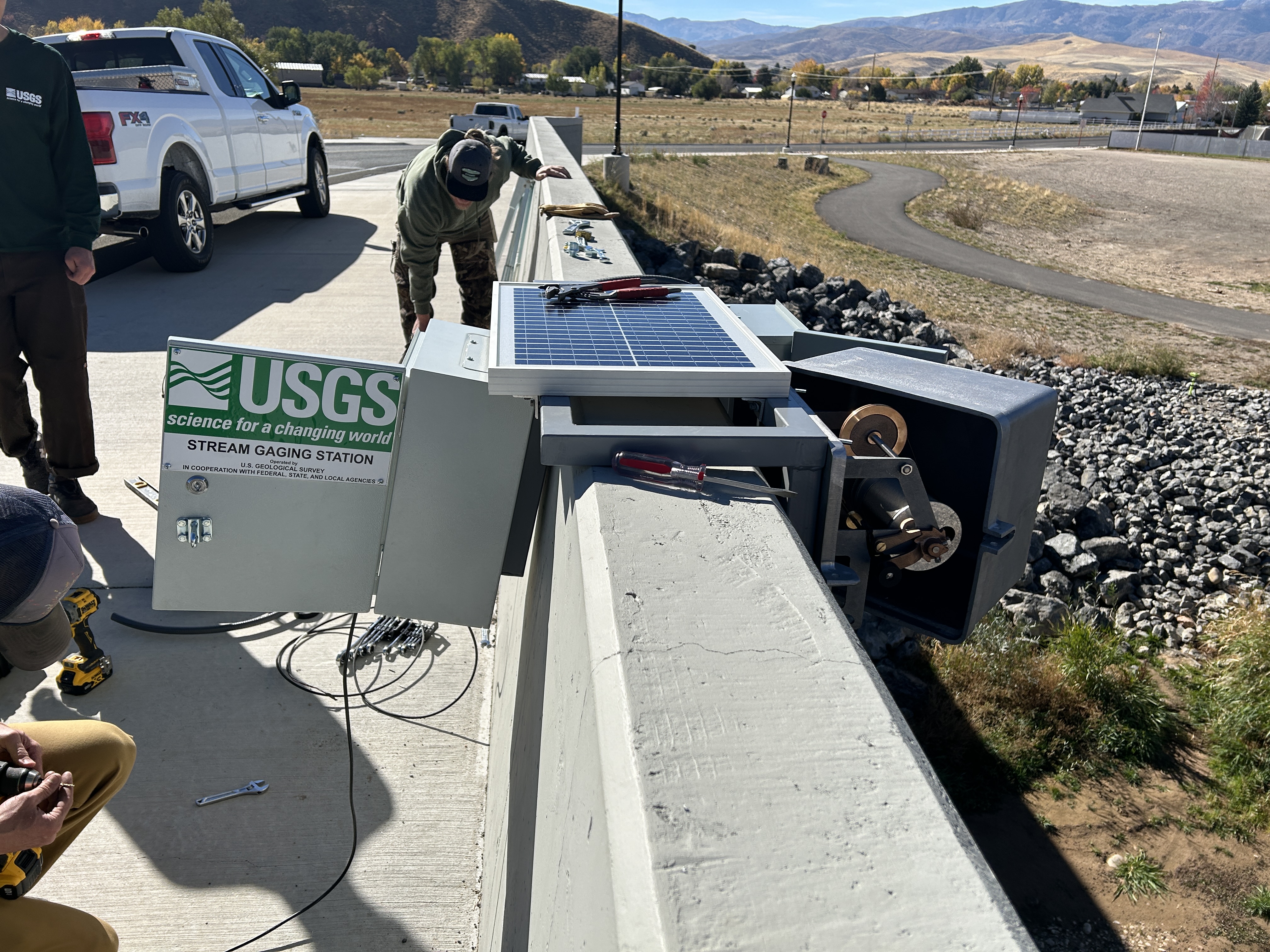 Over-bridge side frame holds housing with reel on river side and communication system on bridge site with solar panel on top that charges battery.