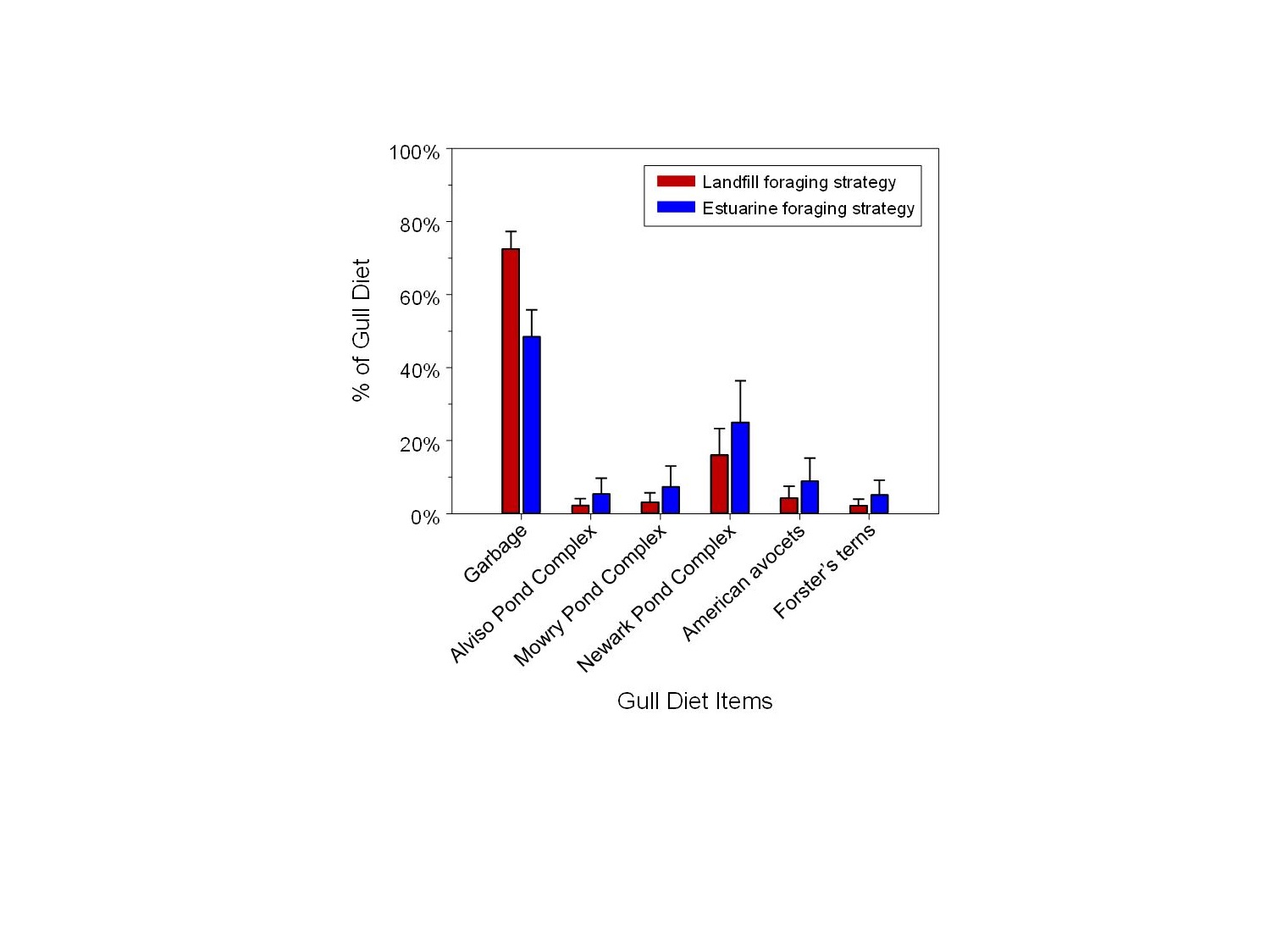 Diet analyses demonstrate that garbage makes up a substantial portion of most California gulls’ diet in San Francisco Bay, even for more estuarine foraging gulls.