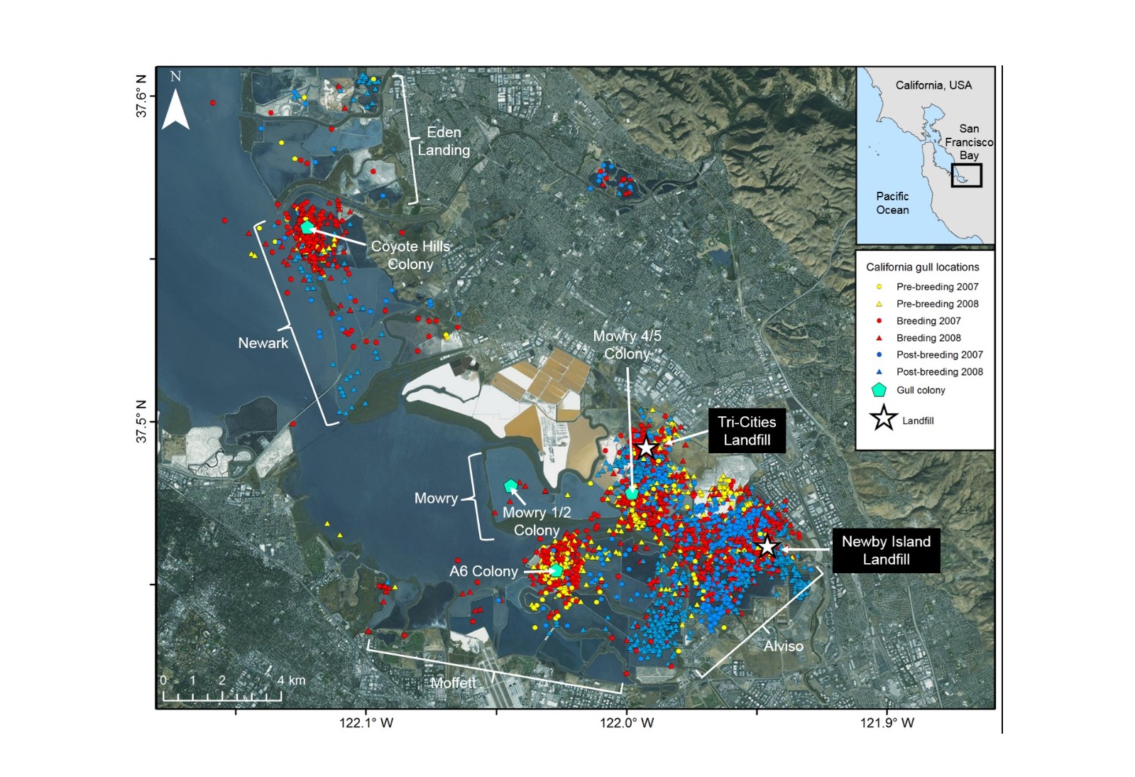 A map showing California Gull colonies and landfills in the south San Francisco Bay