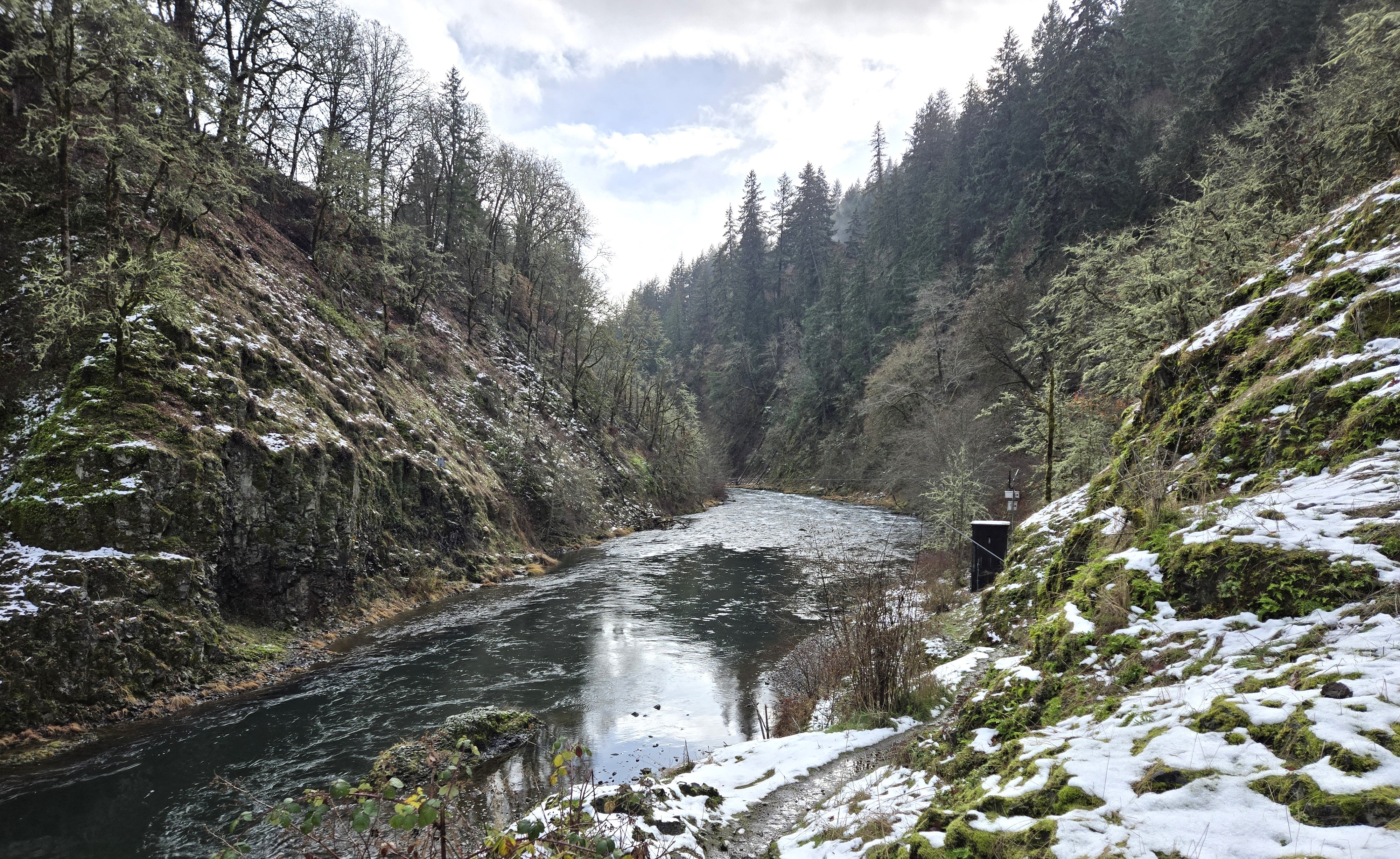 White Salmon River near Underwood, Washington (14123500). Photo taken by Adam Ostman, hydrologic technician, during a routine site visit. The streamgage is the small square building on the right river bank.