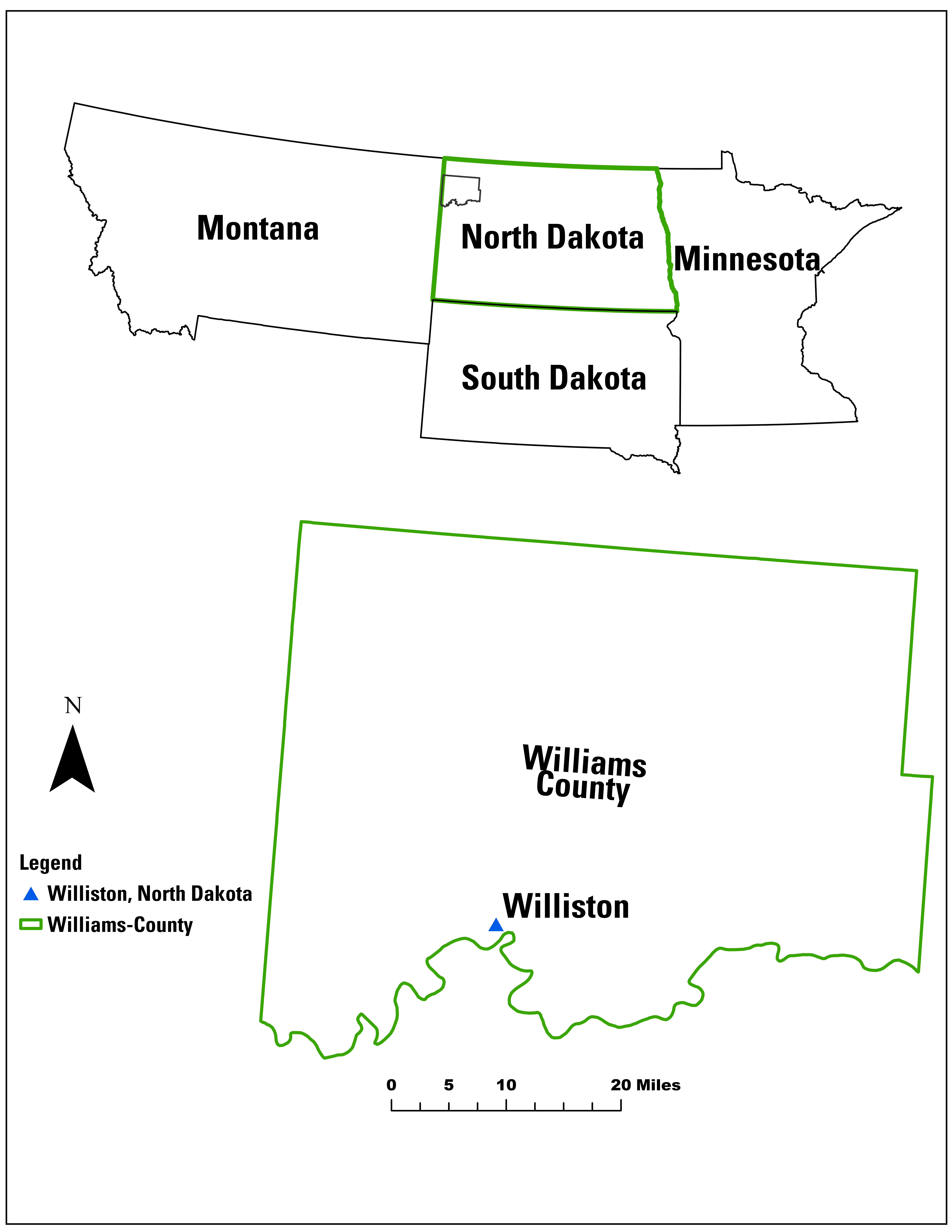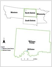 Williston, North Dakota, is located just north of the Missouri River in Williams County (northwestern North Dakota). Locator map by USGS Earth Resources Observation and Science (EROS) Center.