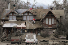 Workers removing ash of a restaurant in Villa La Angostura on June 16 2011 following the Puyehue volcanic eruption, Chile.