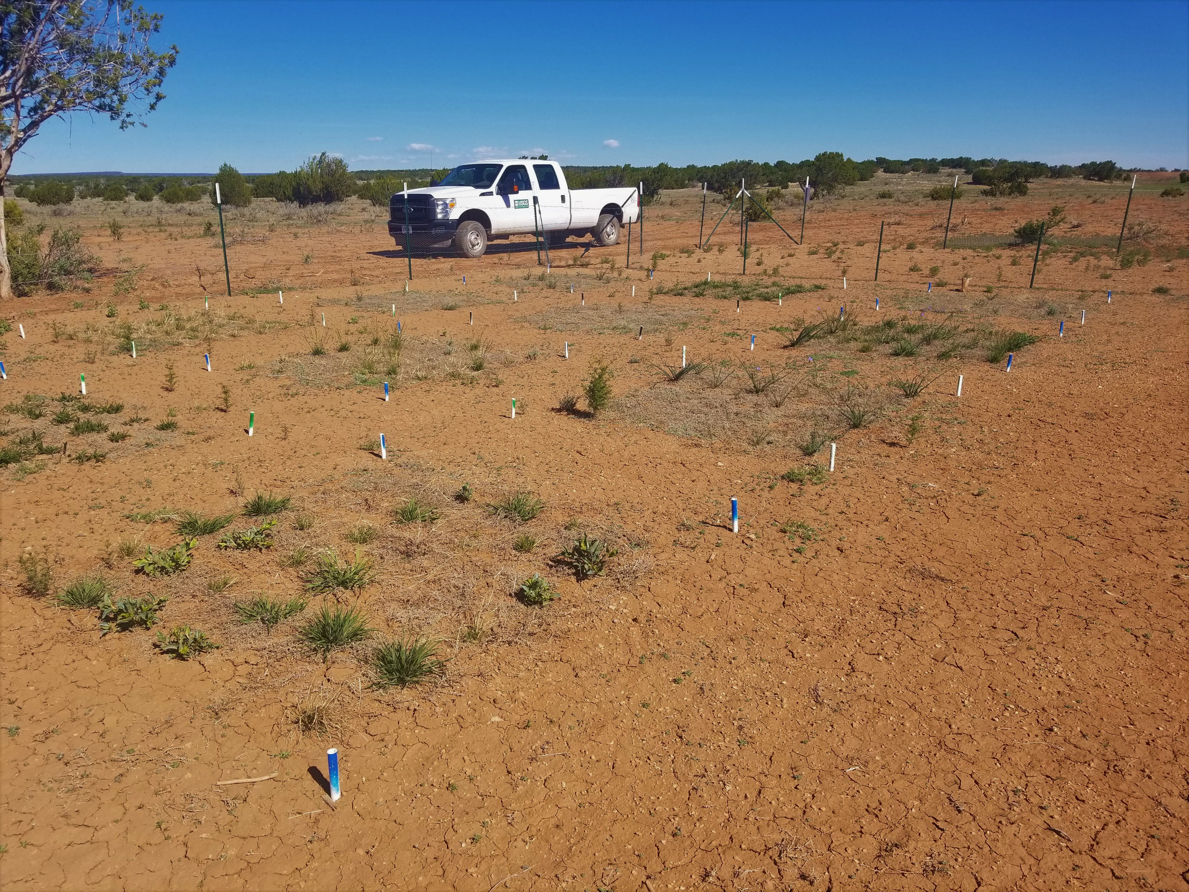 The USGS RAMPS program's RestoreNet experiment works to strengthen land treatment, restoration, and reclamation activity across the Southwestern Deserts. This photo shows the surving plants one year after being installed. Results from this experiment are going to inform restoration. The RestoreNet project is an example of co-produced science, where land managers and scientists work together to design the experiment, interpret results, and create science delivery products that are useful for land managers working to improve the condition of the land.