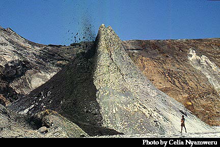 Lava spattering from the top of a small cone on the crater floor at Ol Doinyo Lengai, August 8,1990. Note the person at the base of the cone giving approximate scale. The black lava on the left side of the cone is fresh (erupted within the last hour); the white material on the right side of the cone was black when first erupted and became white over several months.