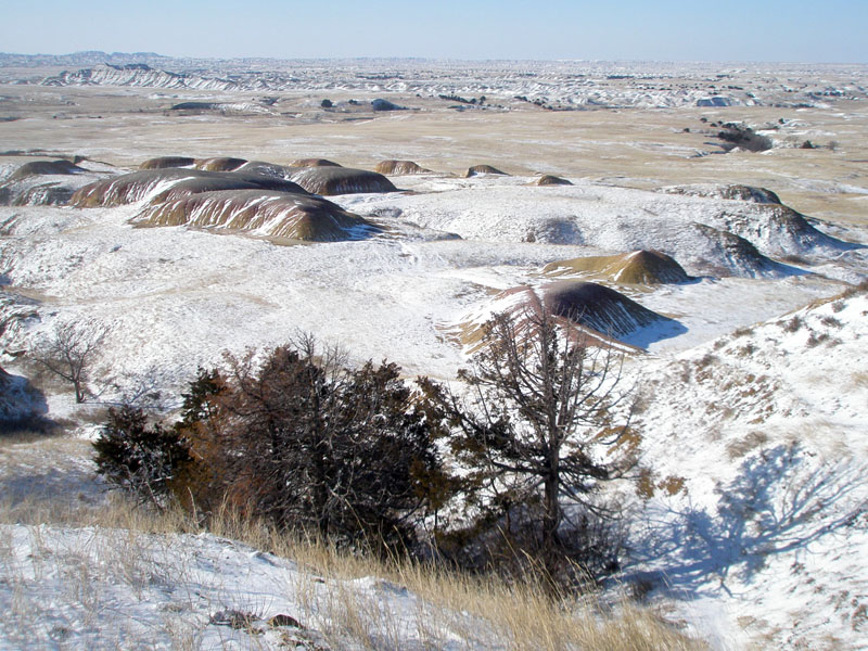 This view is along a wilderness access trail near the Roberts Prairie Dog Town along the Sage Rim Road. Bright-colored buttes in this area gave rise to the name Yellow Mounds, an old term used to identify the brightly colored beds of the upper Fox Hills Formation. A trace of gray mudstone at the base of the Chadron Formation caps each of the small yellow mounds.