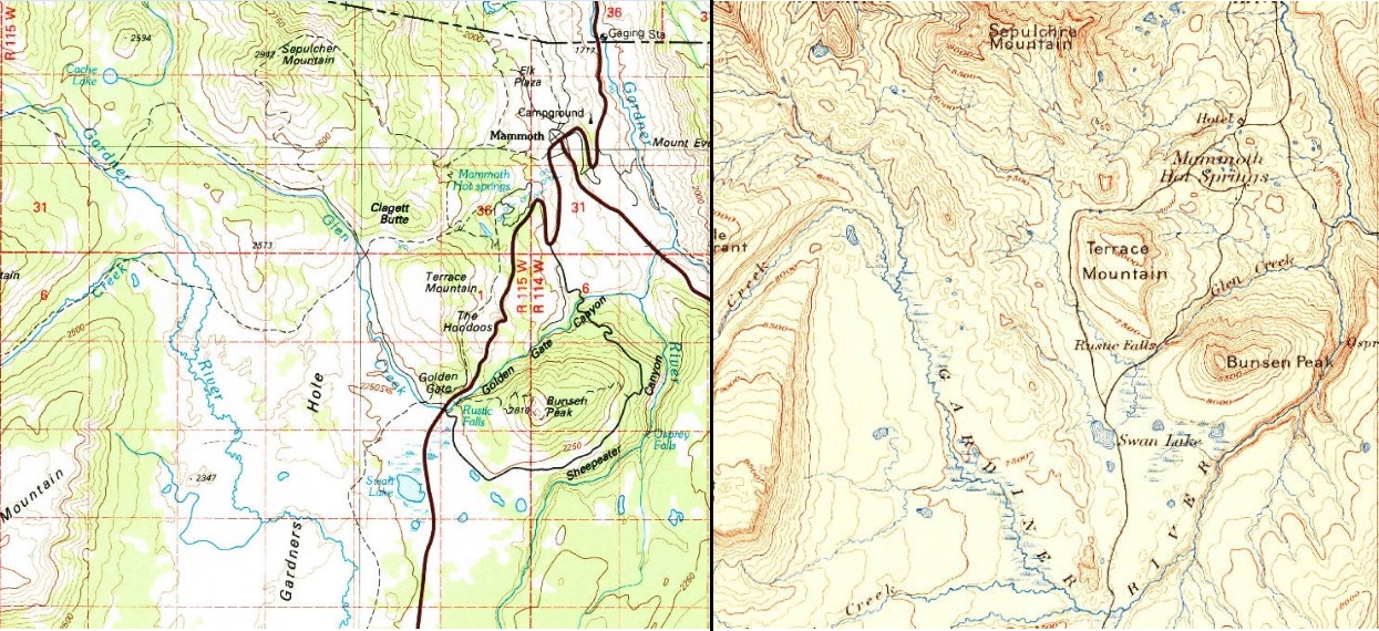 Left: Yellowstone National Park topographic map from 1983. Right: Yellowstone National Park topographic map from nearly a century before, in 1885.